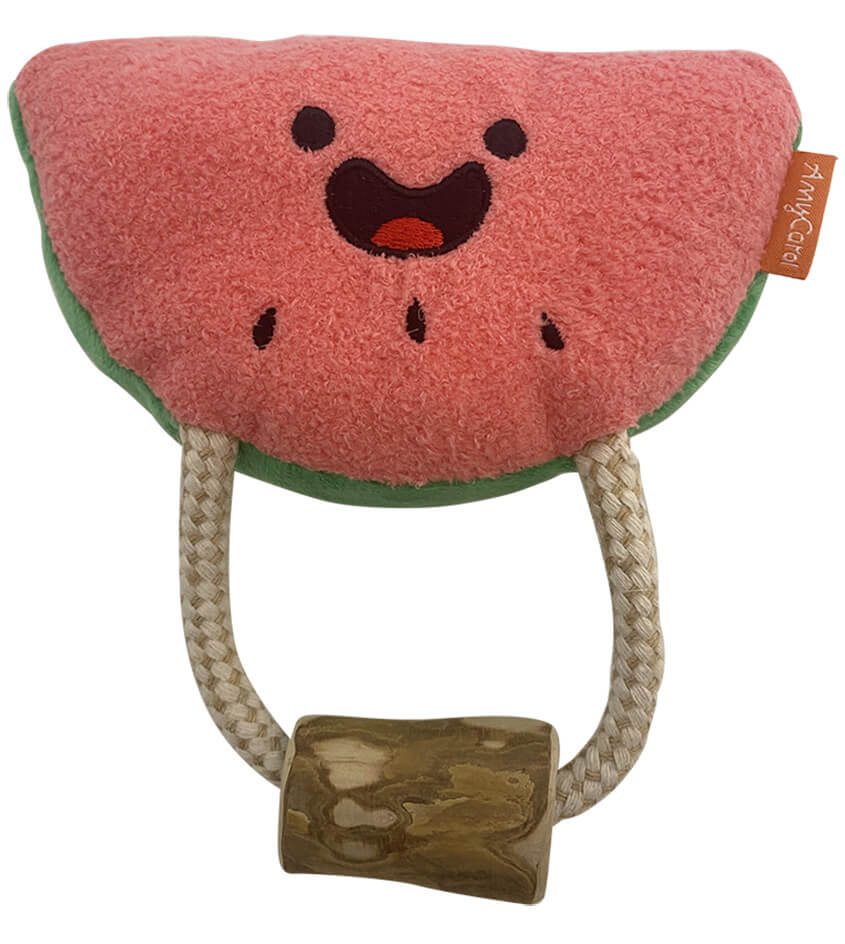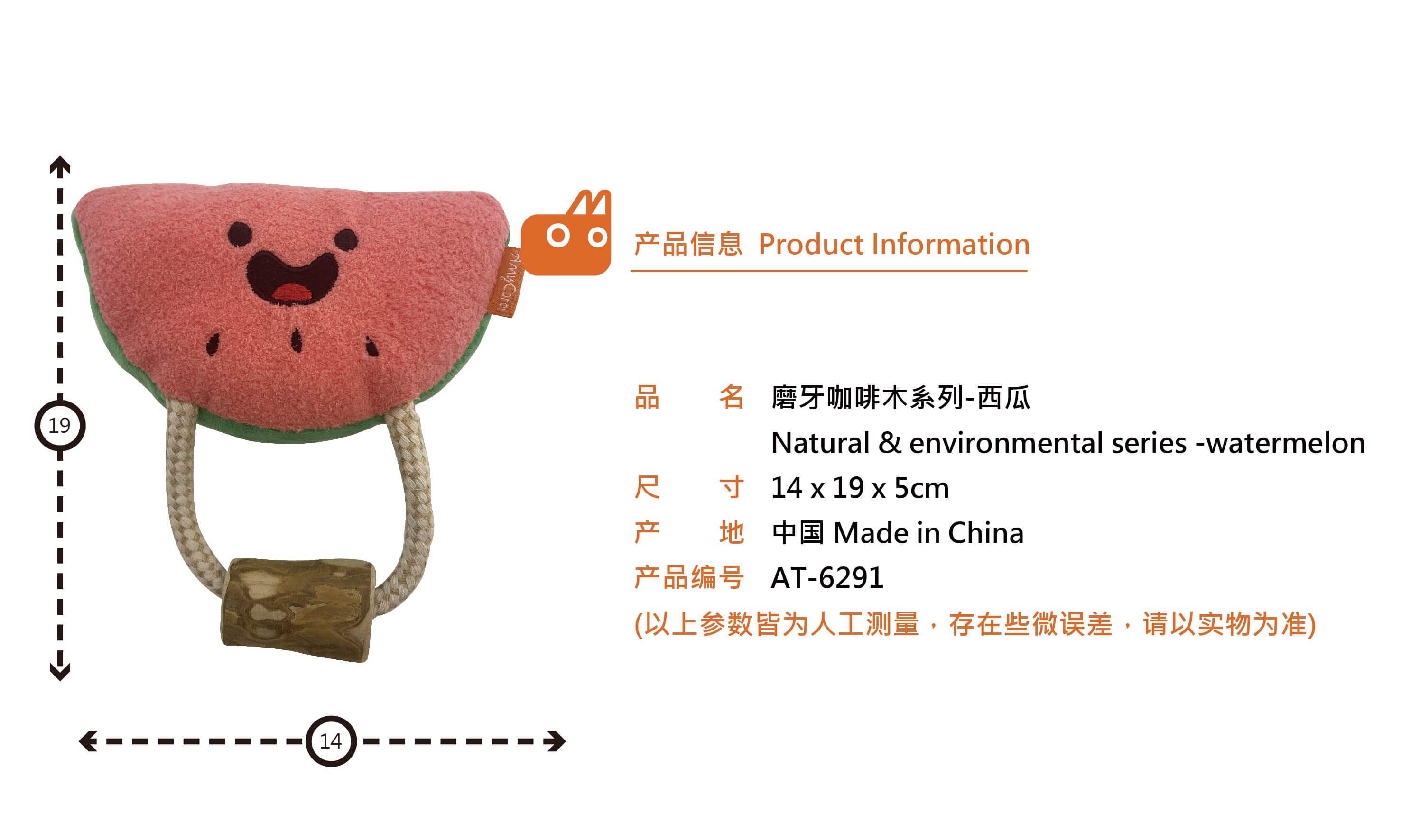AT-6291 磨牙咖啡木系列-西瓜 Product Size : 14cm(L) x 19cm(W) x 5cm(H) Materials:Coffee wood, pearl cashmere, super soft short floss, PP cotton Additional Notes:Squeaker Inside