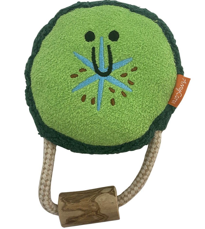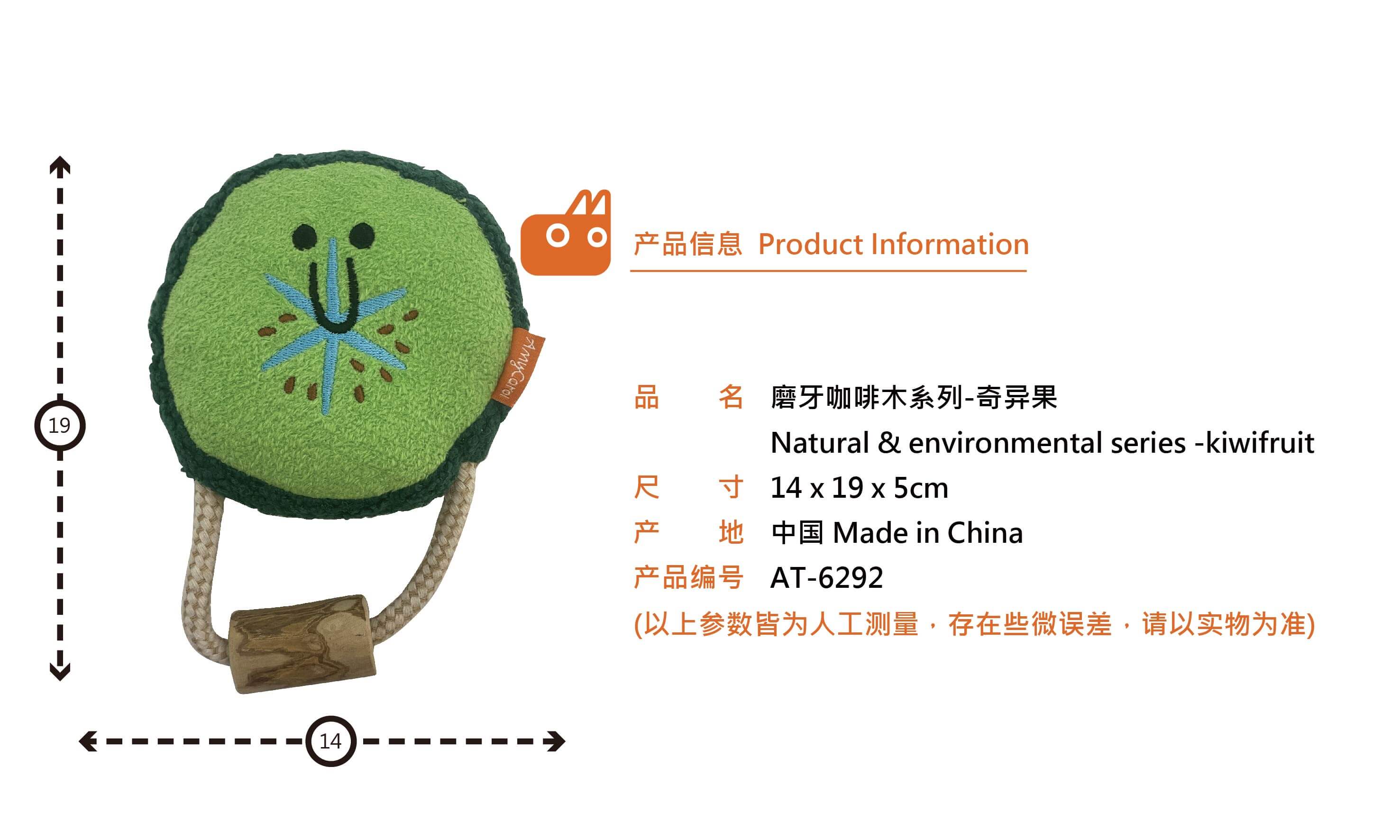 AT-6292 磨牙咖啡木系列-奇异果 Product Size : 14cm(L) x 19cm(W) x 5cm(H) Materials:Coffee wood, mohair, pearl cashmere, PP cotton Additional Notes:Squeaker Inside
