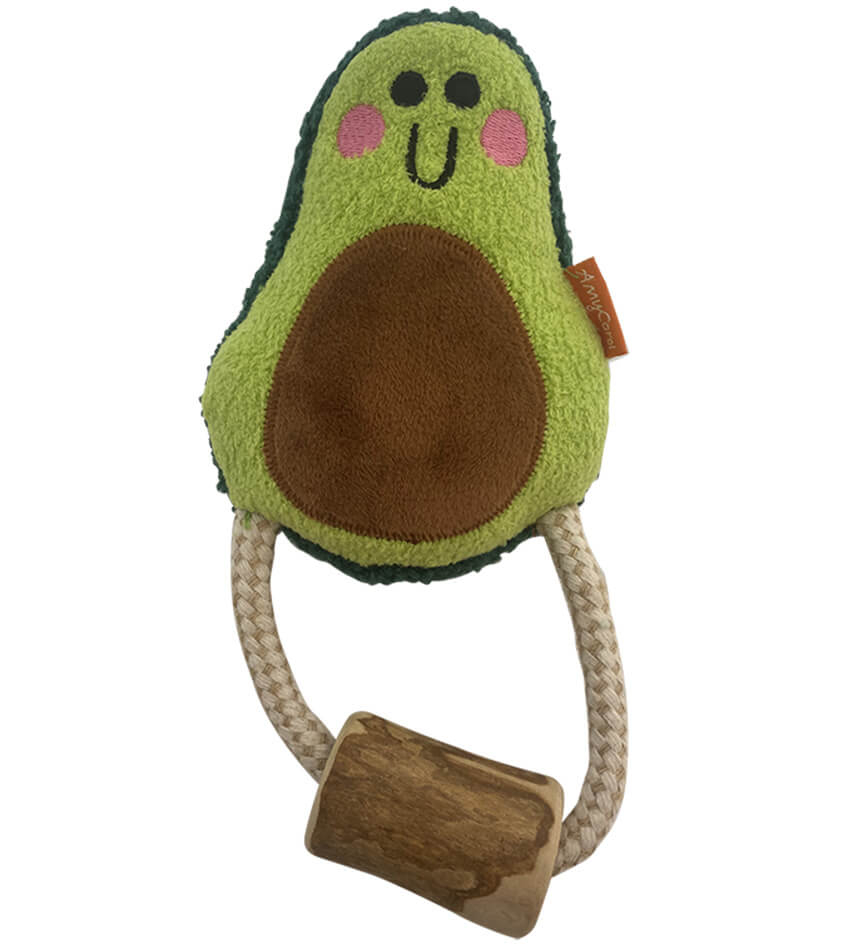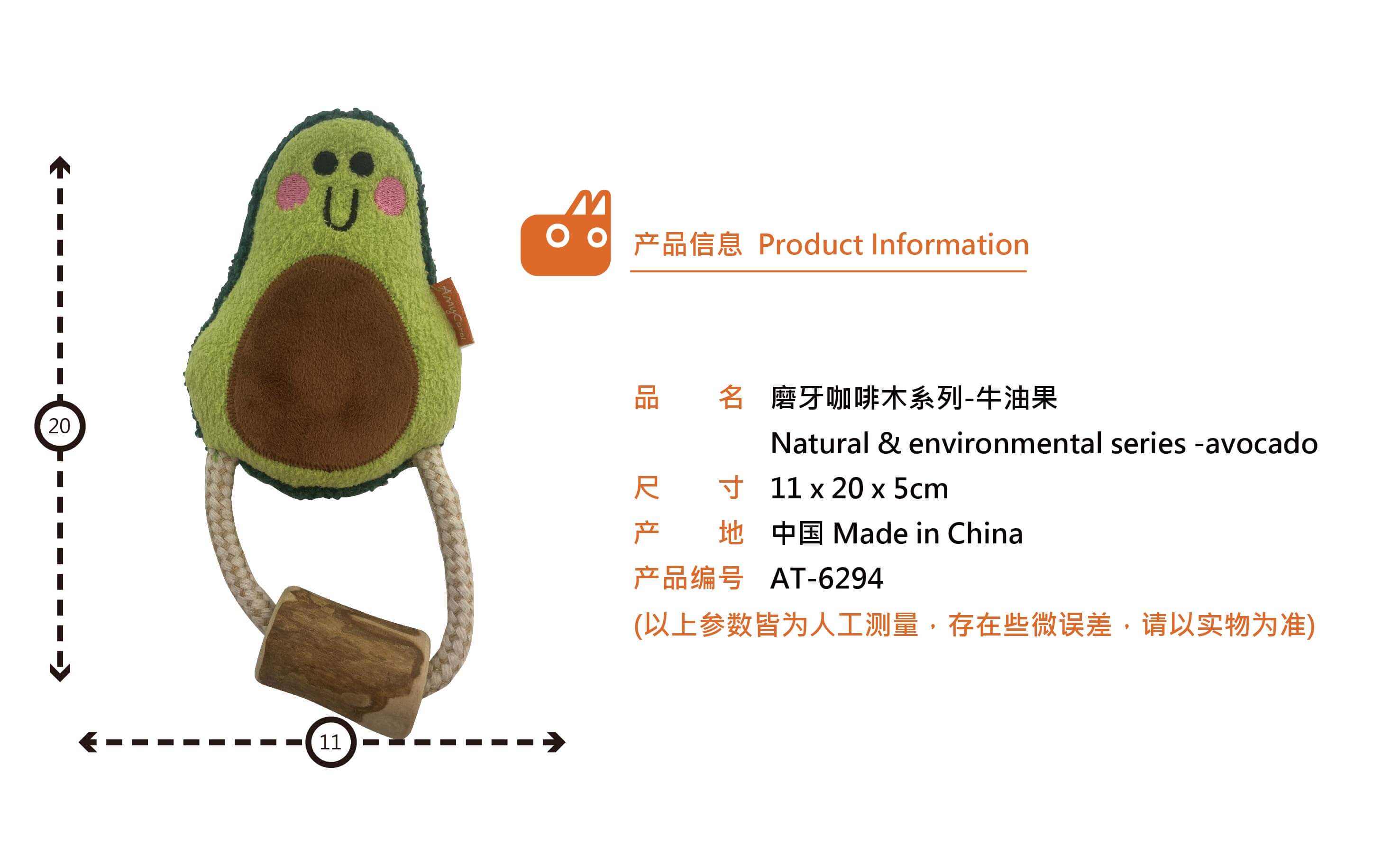 AT-6294 磨牙咖啡木系列-牛油果 Product Size : 11cm(L) x 20cm(W) x 5cm(H) Materials:Coffee wood, pearl cashmere, mohair, super soft short floss, PP cotton Additional Notes:Squeaker Inside