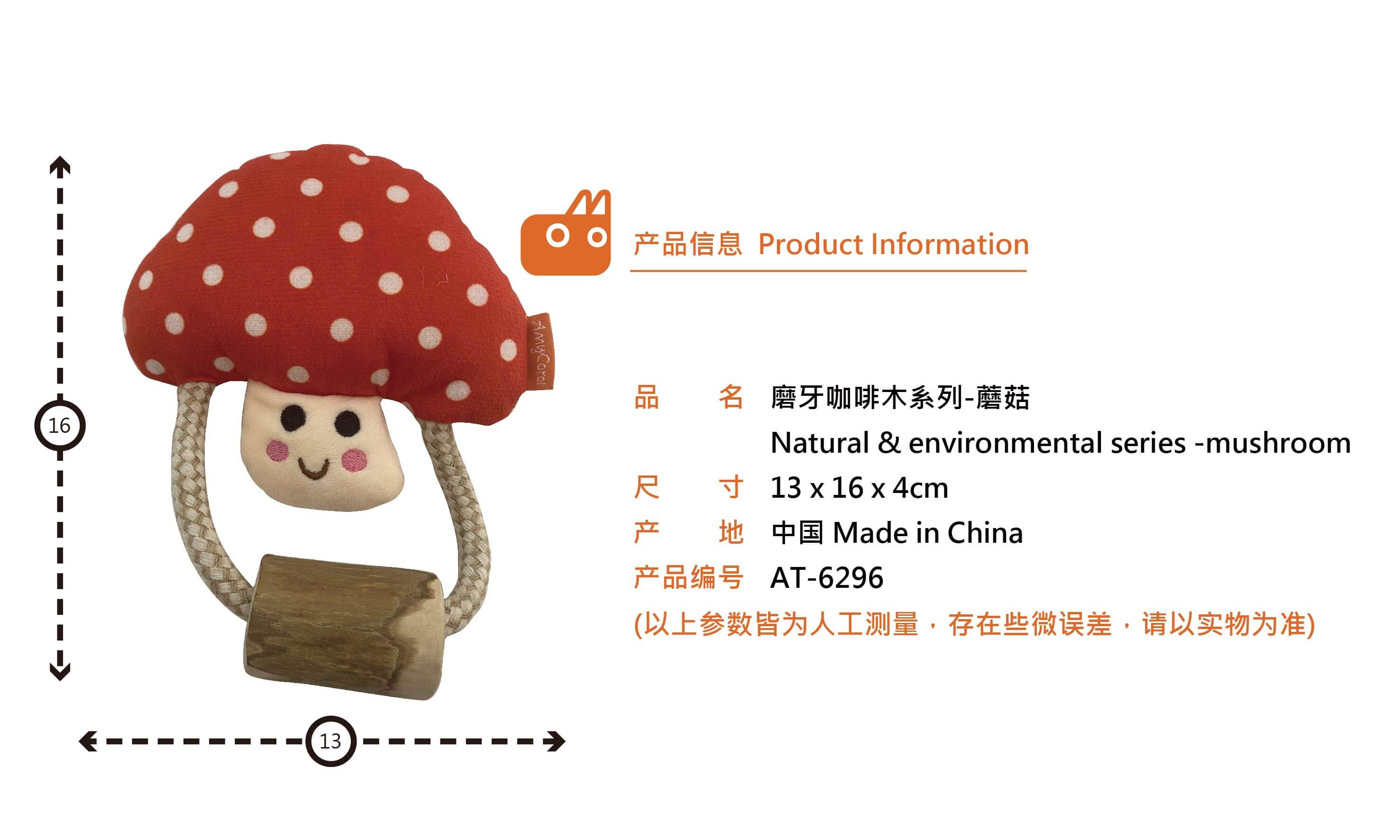 AT-6296 磨牙咖啡木系列-蘑菇 Product Size : 13cm(L) x 16cm(W) x 4cm(H) Materials:Coffee wood, super soft short floss, PP cotton Additional Notes:Squeaker Inside