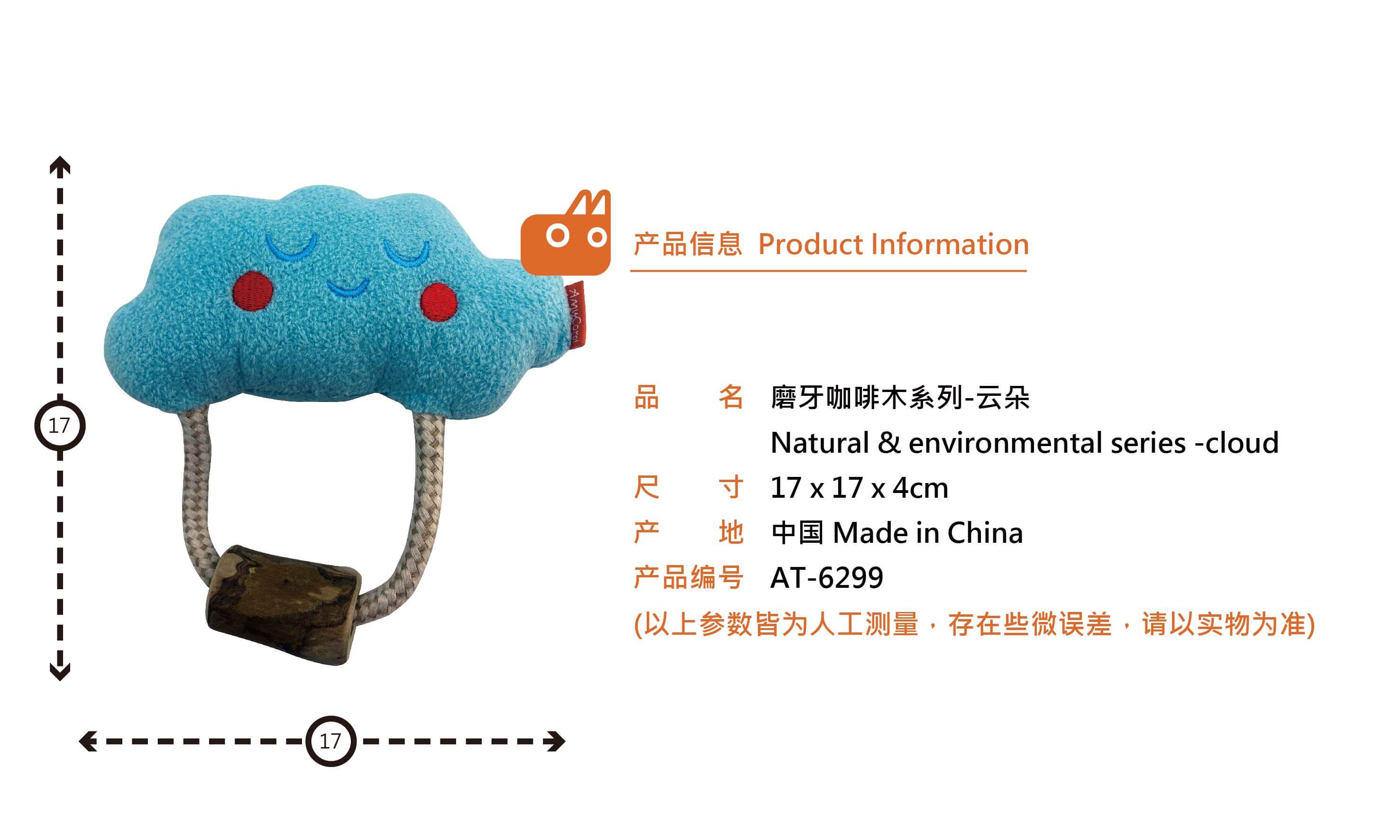 AT-6299 磨牙咖啡木系列-云朵 Product Size : 17cm(L) x 17cm(W) x 4cm(H) Materials:Coffee wood, pearl cashmere, PP cotton Additional Notes:Squeaker Inside