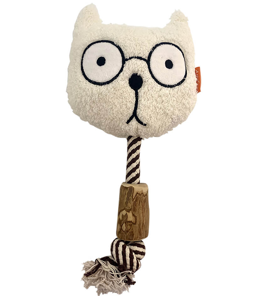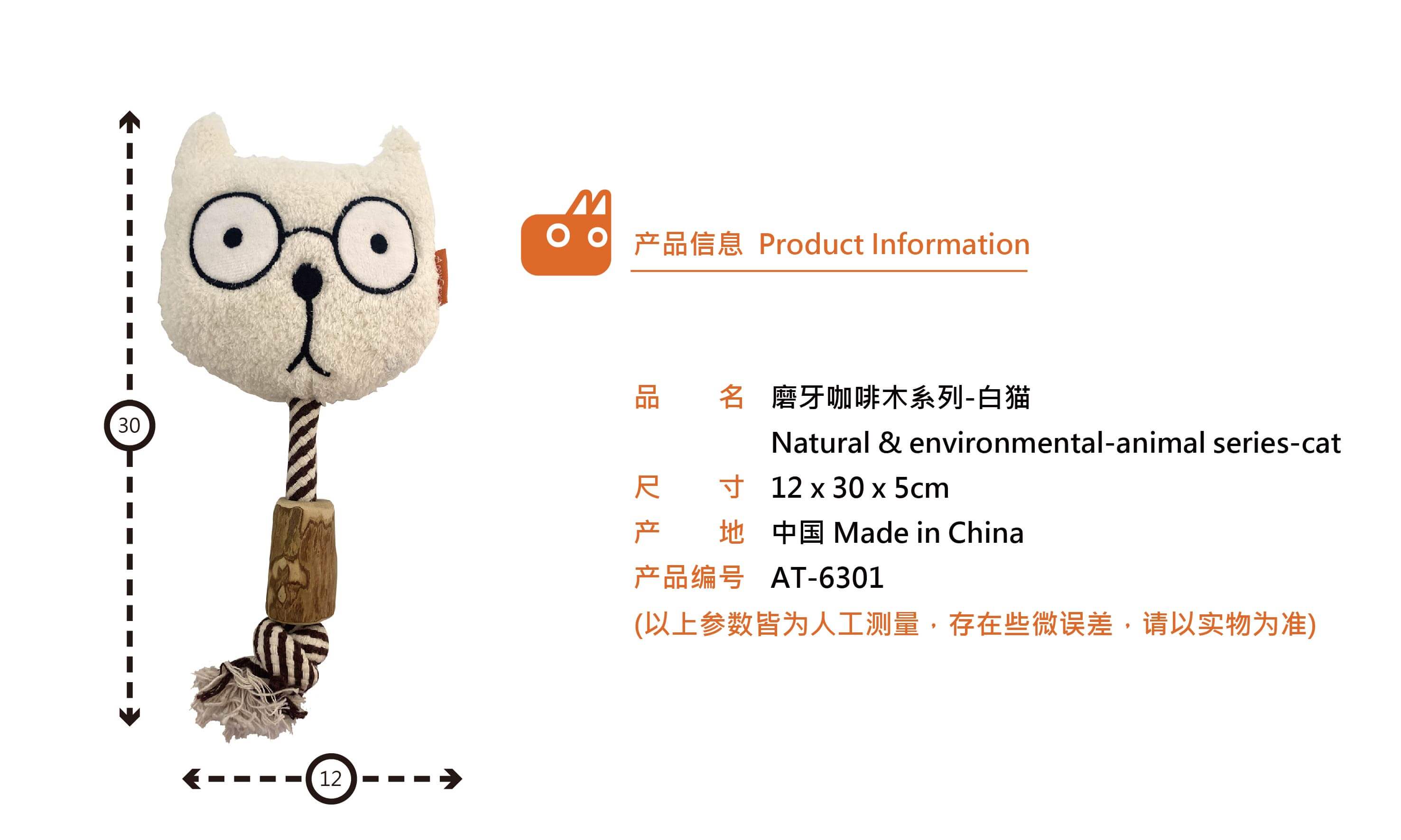 AT-6301 磨牙咖啡木系列-白猫 Product Size : 12cm(L) x 30cm(W) x 5cm(H) Materials:Coffee wood, cloud velvet, super soft short floss, PP cotton Additional Notes:Squeaker Inside, cotton rope