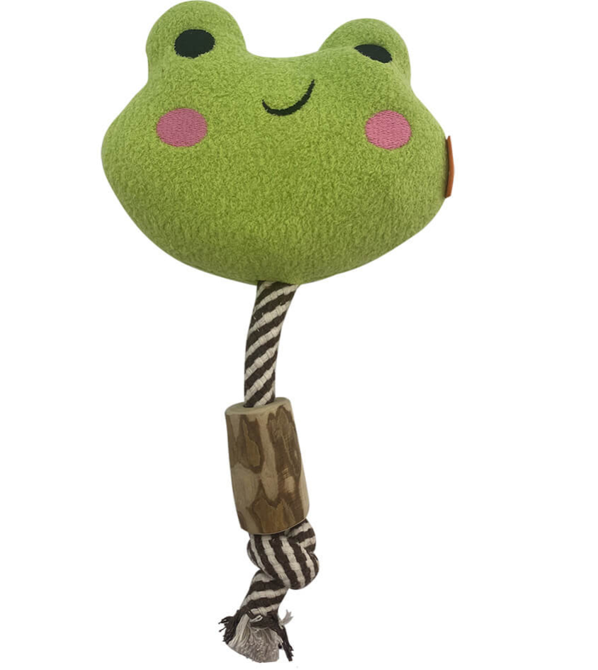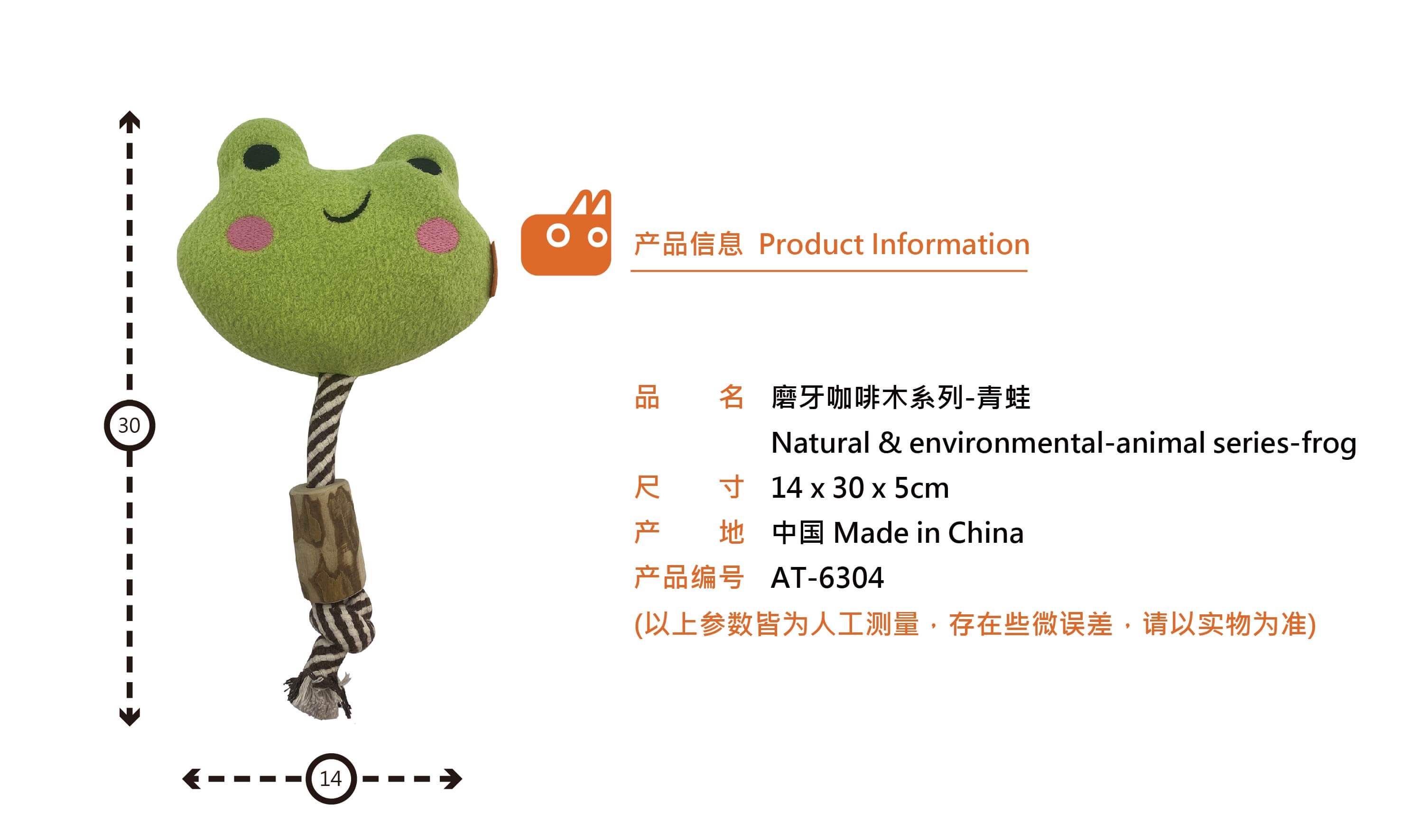 AT-6304 磨牙咖啡木系列-青蛙 Product Size : 14cm(L) x 30cm(W) x 5cm(H) Materials:Coffee wood, pearl cashmere, PP cotton Additional Notes:Squeaker Inside, cotton rope