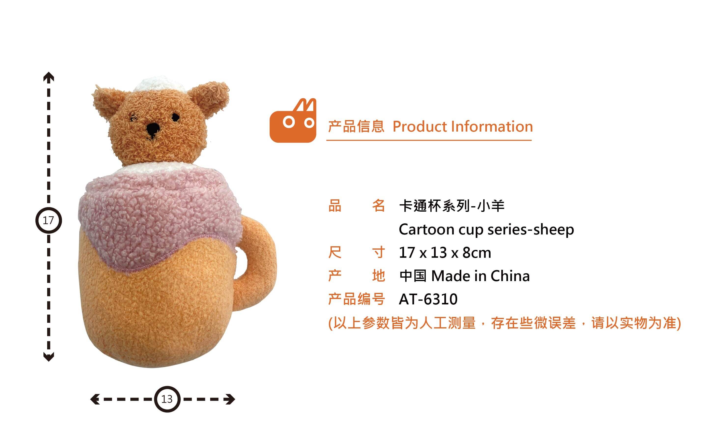 AT-6310 卡通杯系列-小羊 Product Size : 17cm(L) x 13cm(W) x 8cm(H) Materials:Polyester fabrics, mohair, pearl cashmere, PP cotton Additional Notes:Squeaker Inside