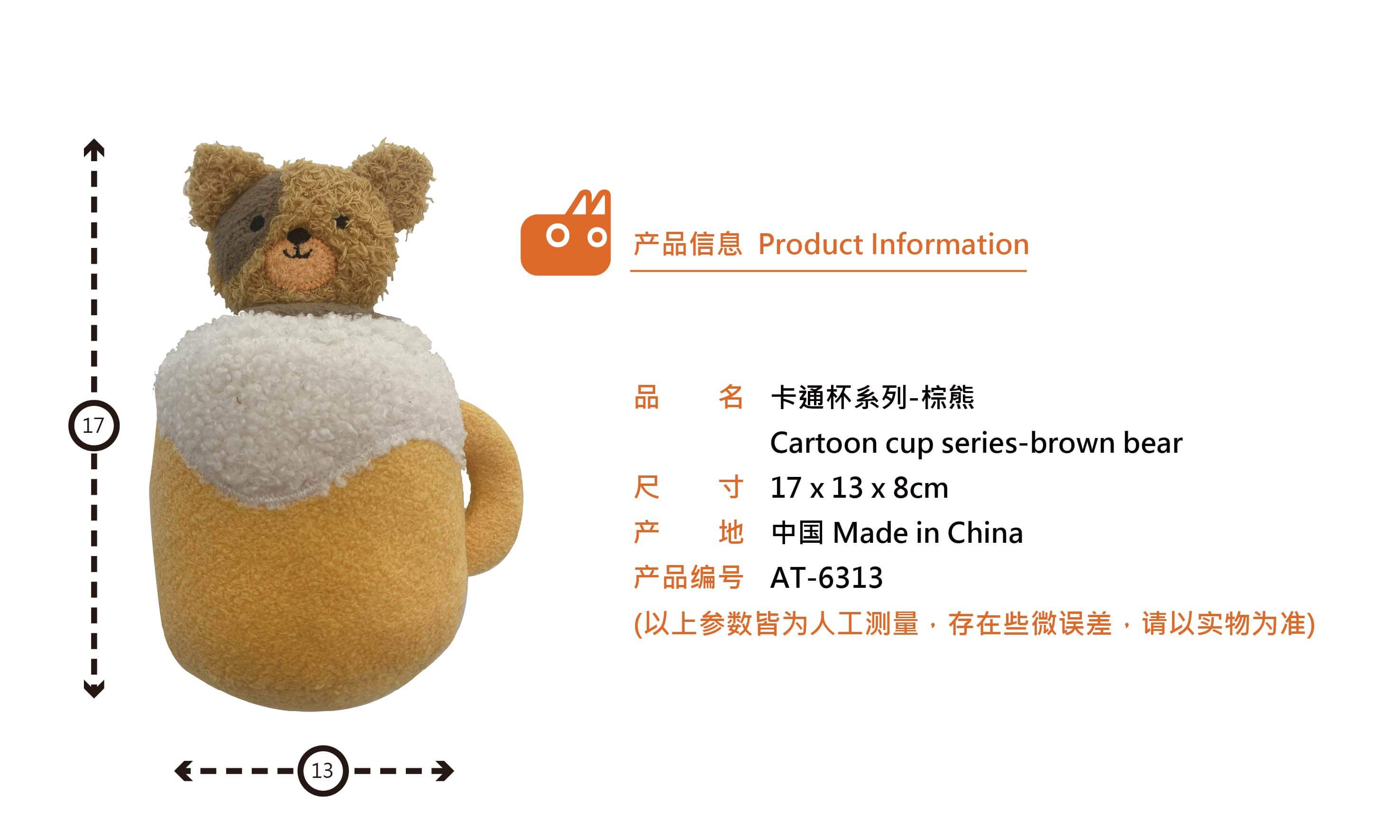AT-6313 卡通杯系列-棕熊 Product Size : 17cm(L) x 13cm(W) x 8cm(H) Materials:Polyester fabrics, mohair, pearl cashmere, super soft short floss, PP cotton Additional Notes:Squeaker Inside