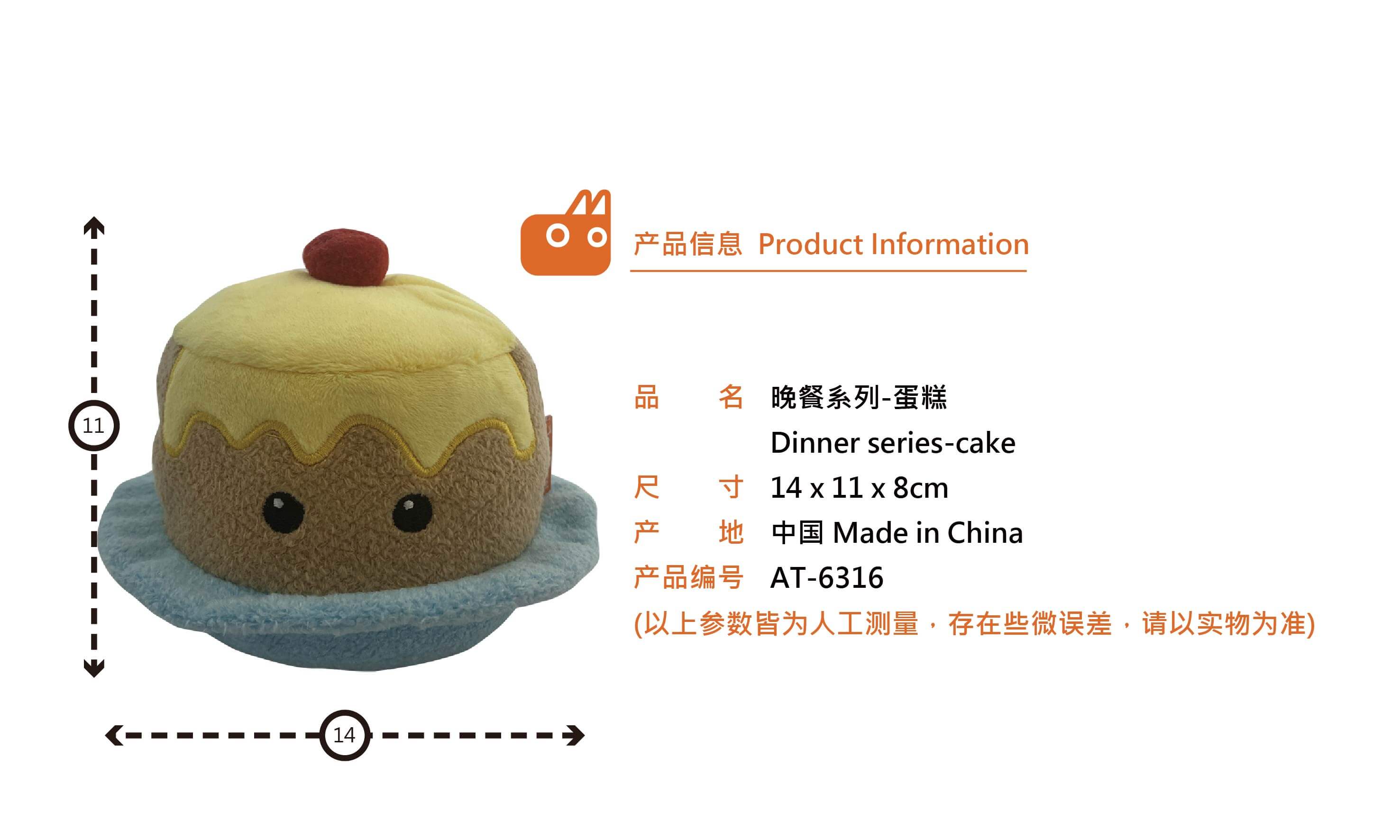 AT-6316 晚餐系列-蛋糕 Product Size : 14cm(L) x 11cm(W) x 8cm(H) Materials:Super soft short floss, pearl cashmere, PP cotton Additional Notes:Squeaker Inside