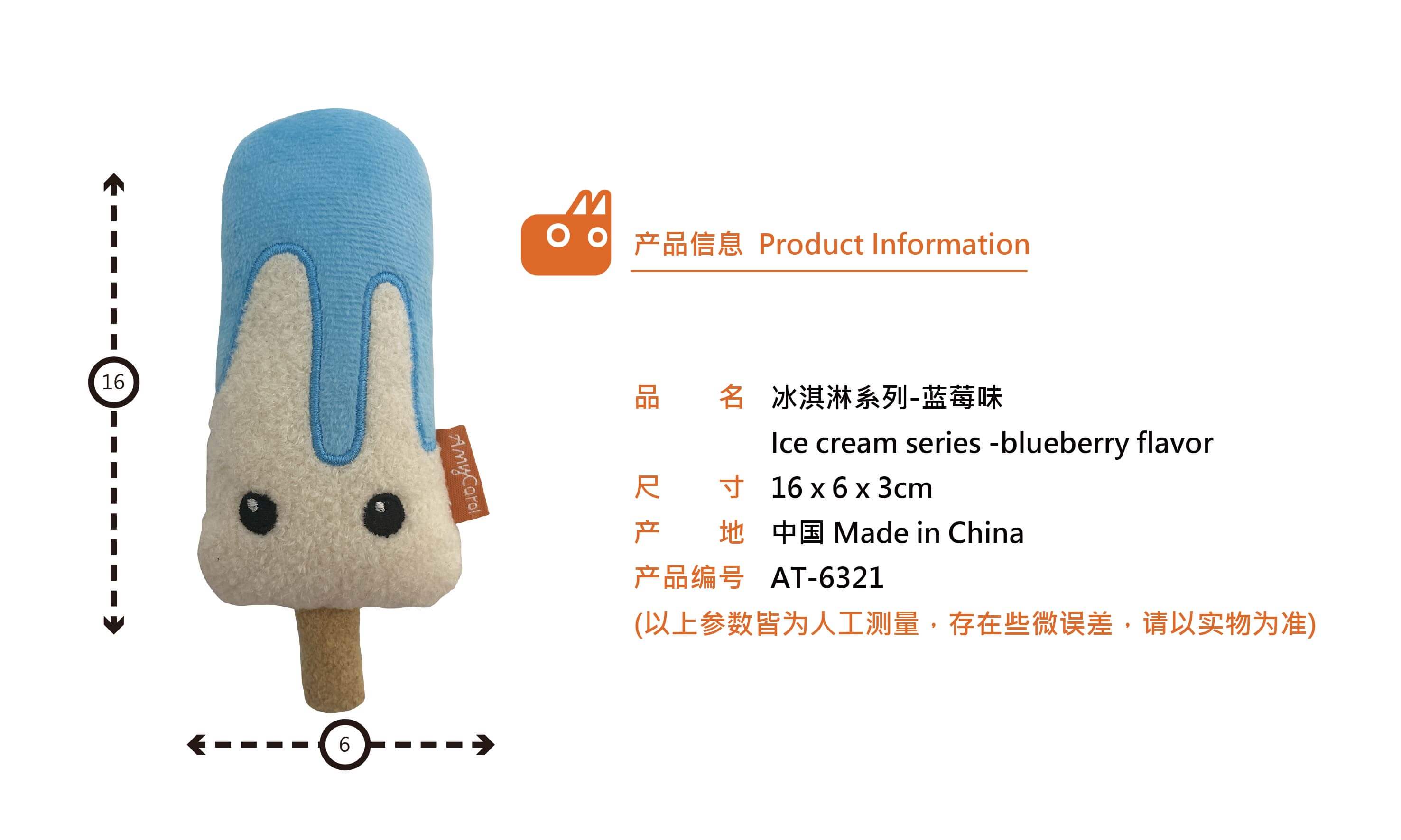 AT-6321 冰淇淋系列-蓝莓味 Product Size : 16cm(L) x 6cm(W) x 3cm(H) Materials:Pearl cashmere, super soft short floss, PP cotton Additional Notes:Squeaker Inside