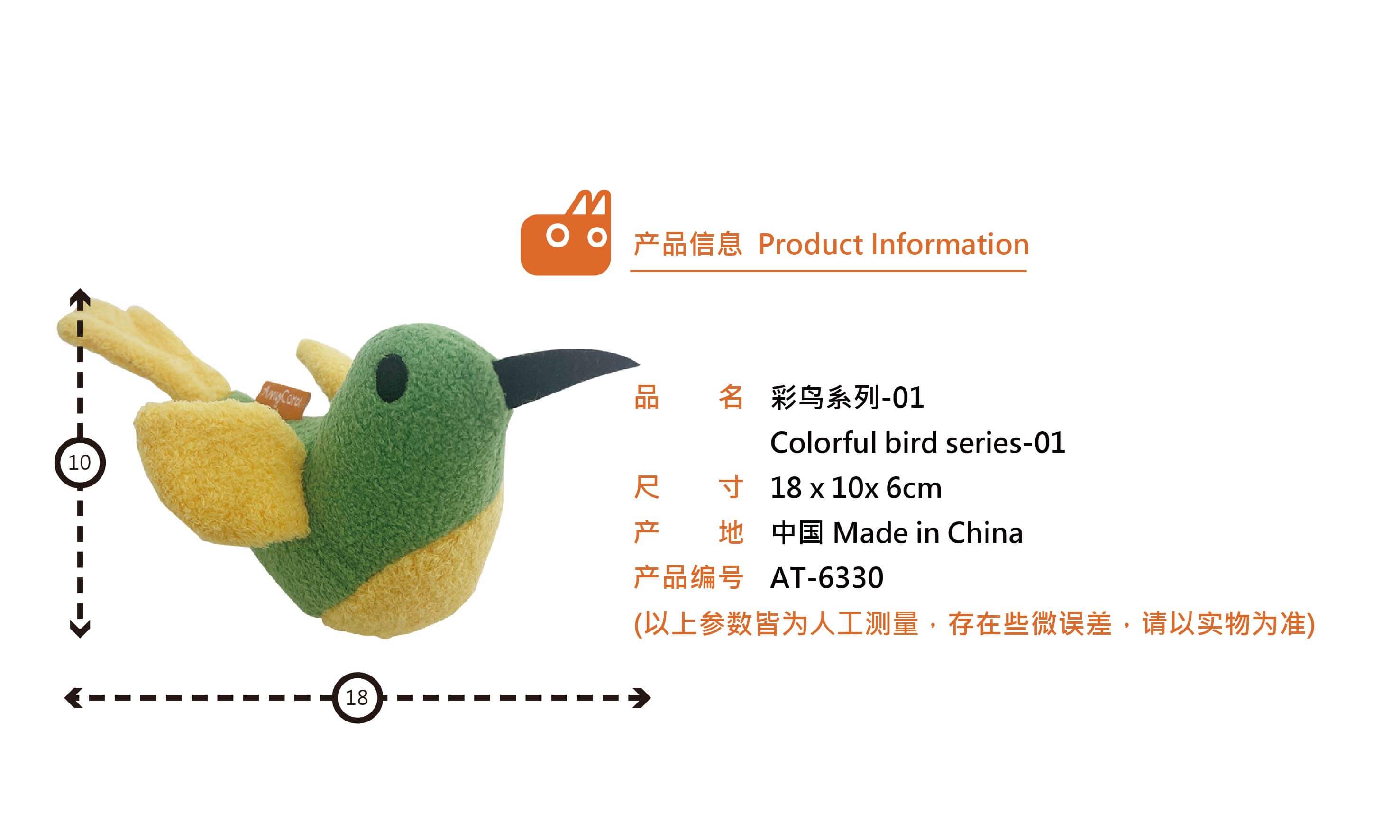 AT-6330 彩鸟系列-01 Product Size : 18cm(L) x 10cm(W) x 6cm(H) Materials:Pearl cashmere, non-woven fabric, PP cotton Additional Notes:Rattle Inside