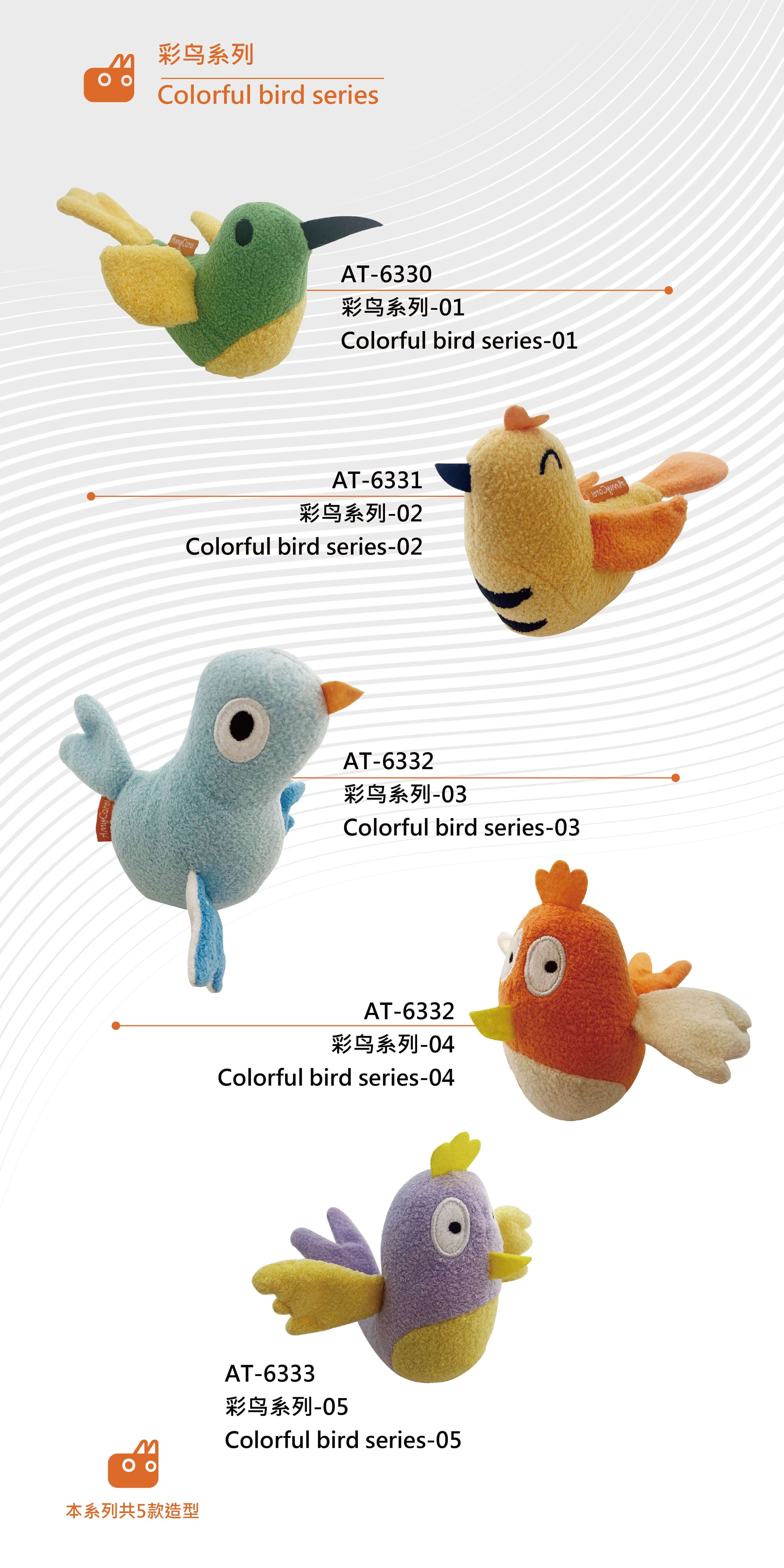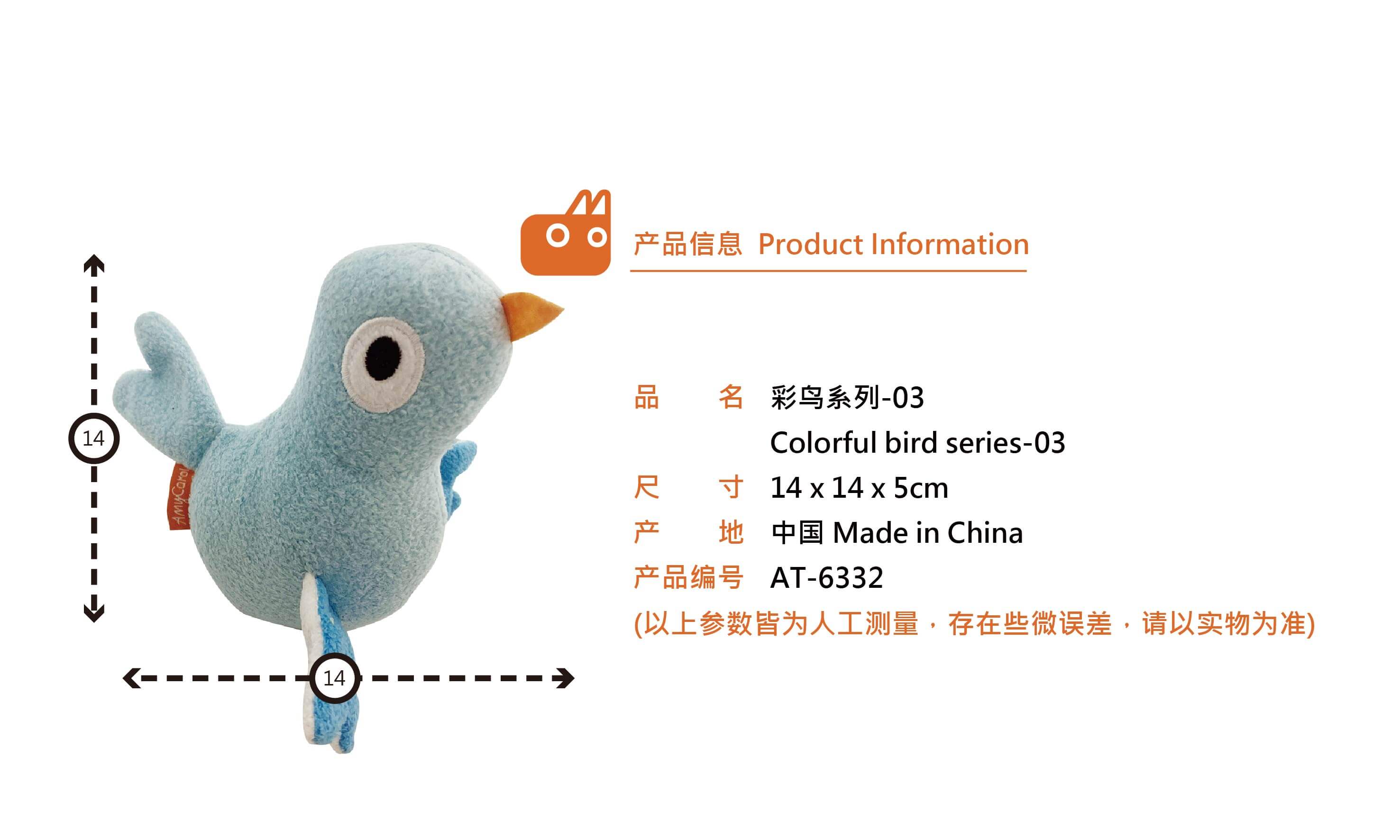 AT-6332 彩鸟系列-03 Product Size : 14cm(L) x 14cm(W) x 5cm(H) Materials:Pearl cashmere, non-woven fabric, PP cotton Additional Notes:Rattle Inside