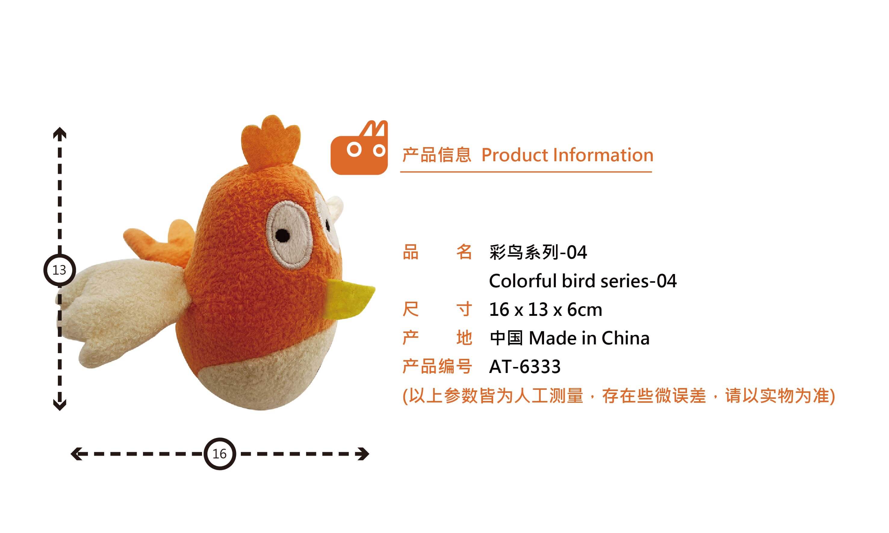 AT-6333 彩鸟系列-04 Product Size : 16cm(L) x 13cm(W) x 6cm(H) Materials:Pearl cashmere, non-woven fabric, PP cotton Additional Notes:Rattle Inside