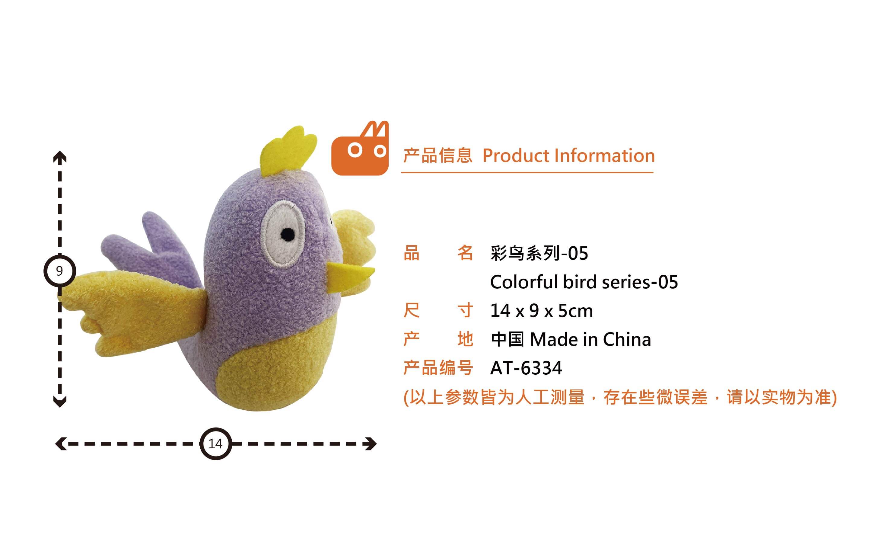 AT-6334 彩鸟系列-05 Product Size : 14cm(L) x 9cm(W) x 5cm(H) Materials:Pearl cashmere, non-woven fabric, PP cotton Additional Notes:Rattle Inside