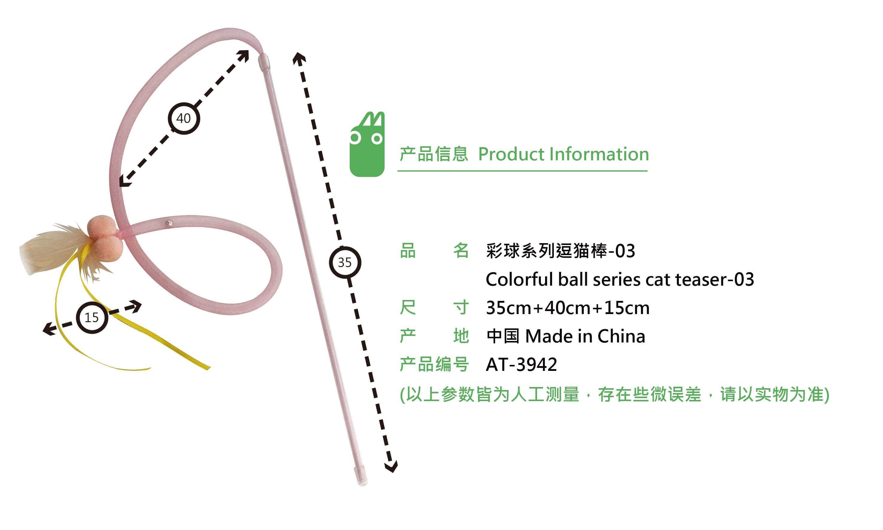 AT-3942 彩球系列逗猫棒-03 Product Size: 35+40+15cm Materials:PVC stick, nylon mesh tube, pendant (polyester, turkey feather)