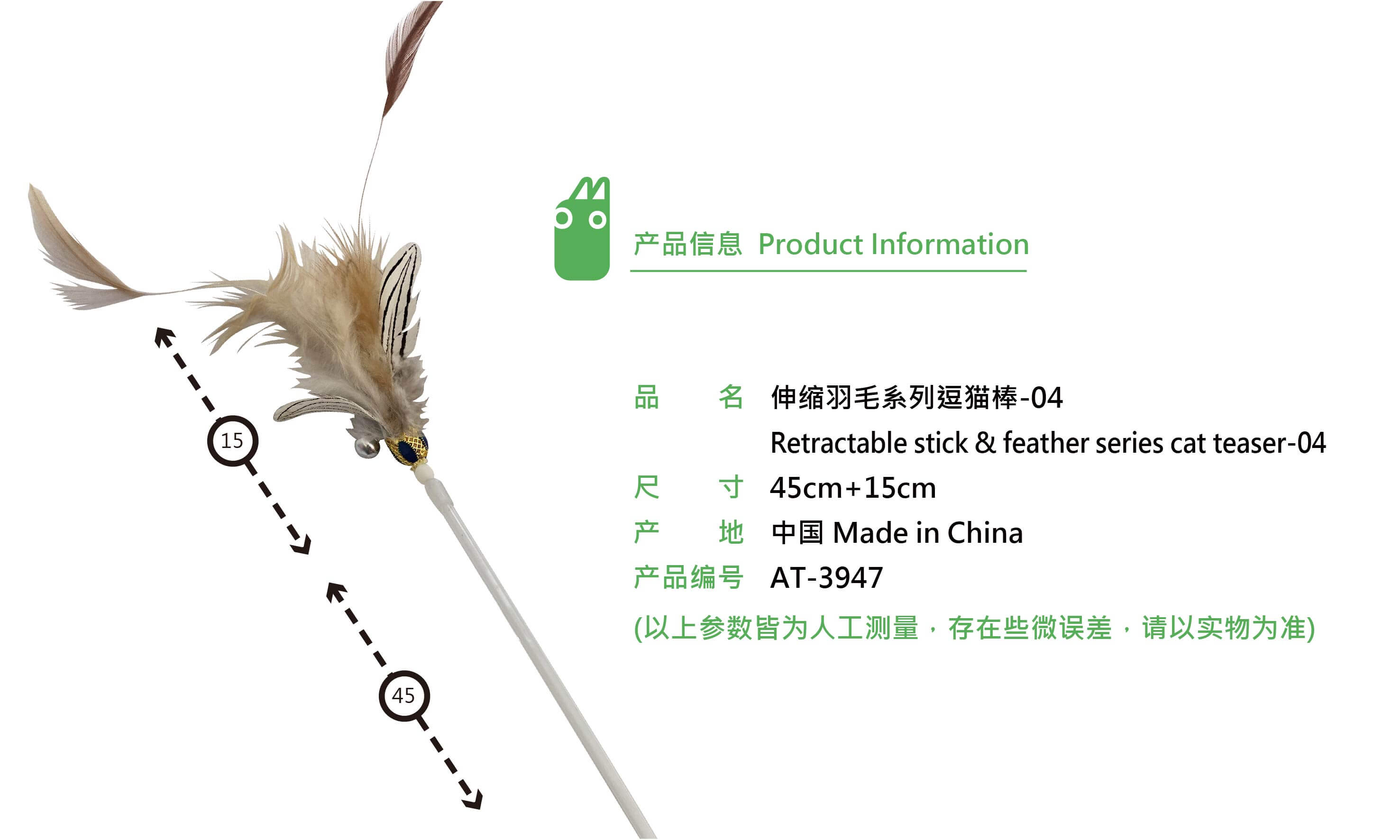 AT-3947 伸缩羽毛系列逗猫棒-04 Product Size: 45+15cm Materials:PVC stick, chicken feather