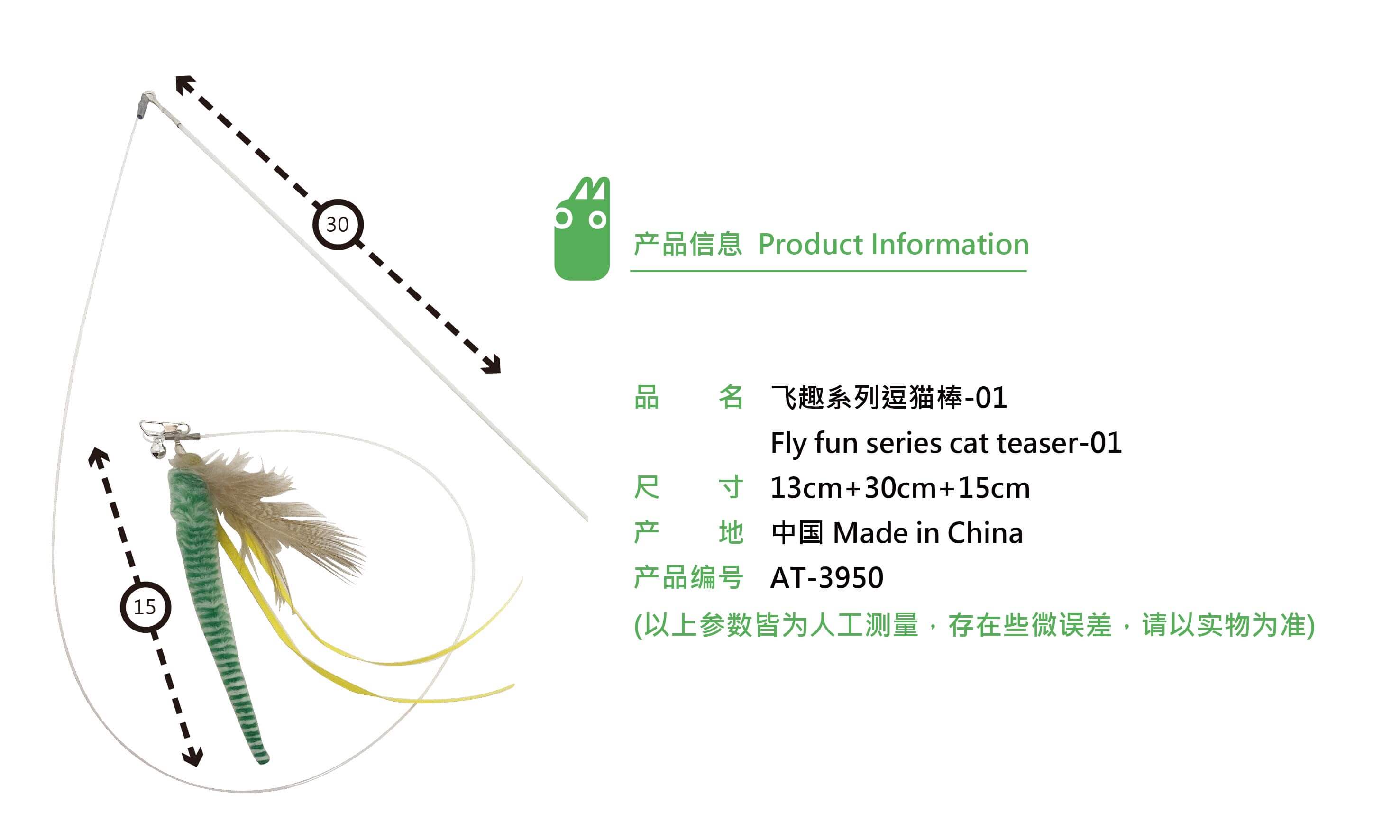 AT-3950 飞趣系列逗猫棒-01 Product Size: 13+30+15cm Materials:PMMA handle, Carbon fiber stick, pendant (polyester, chicken feather)